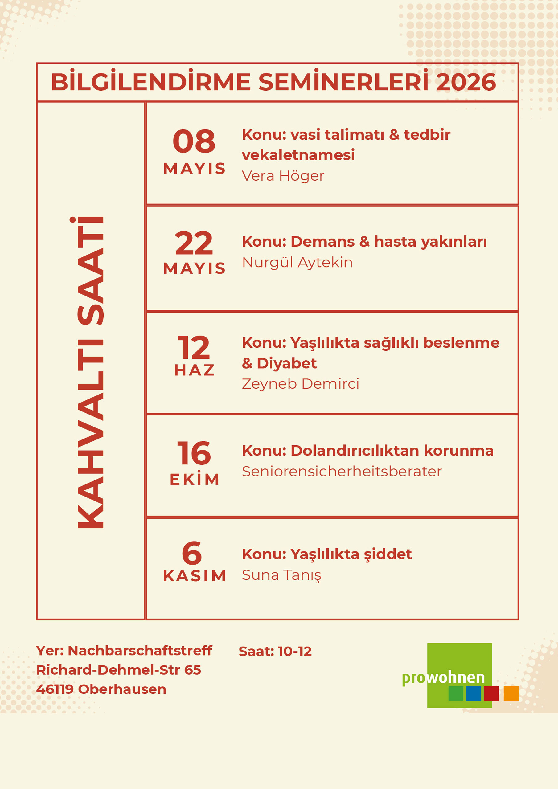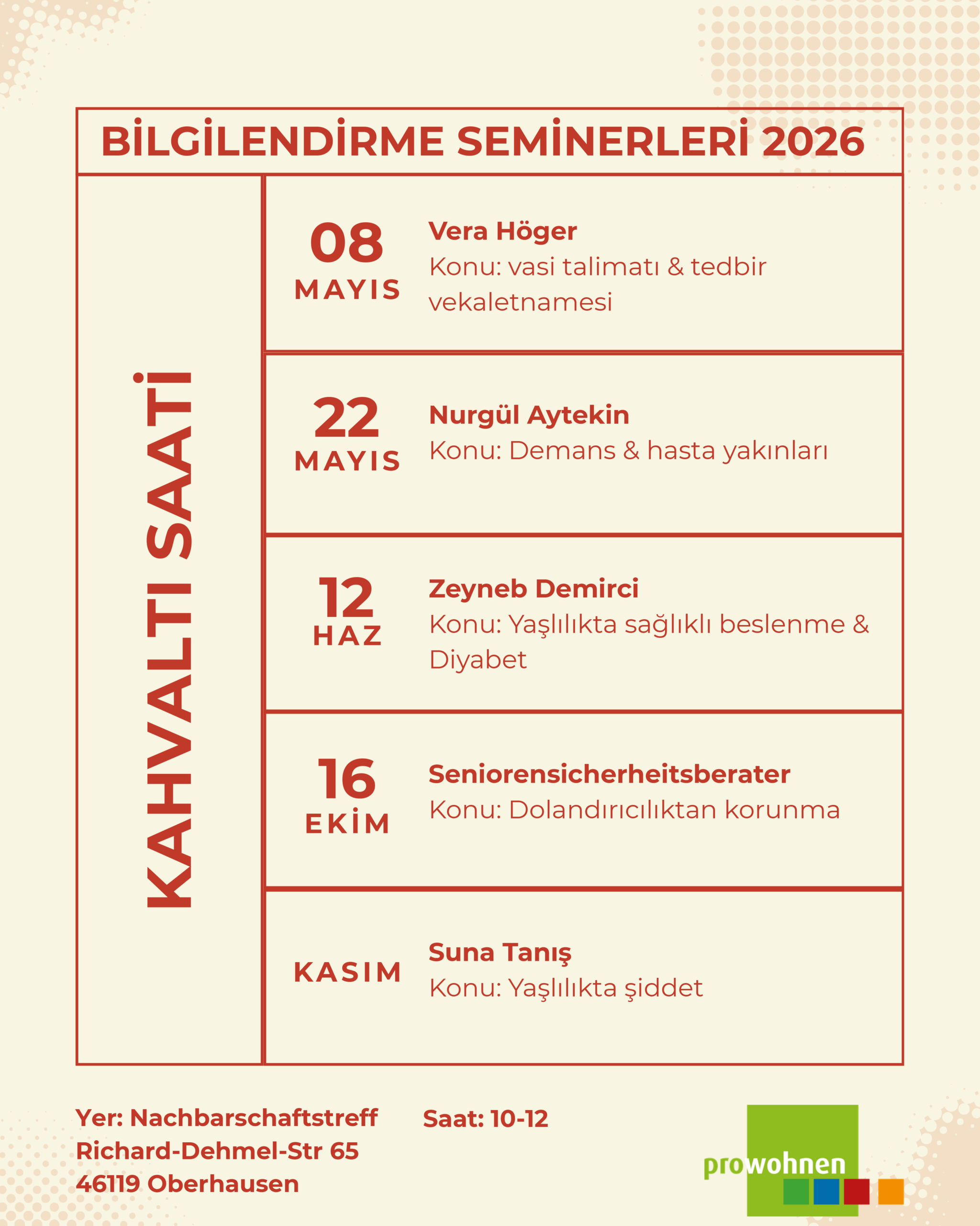 pro wohnen international fahri olarak yabancı uyruklu yaşlılar, emekliler, ve bakıma muhtaç kişiler ve aile fertleri için çalışan, danışmanlık ve yardım hizmetleri sunan bir dernektir.